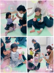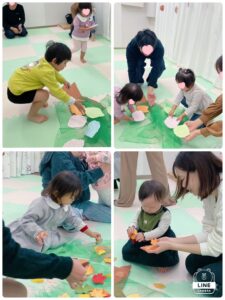 「どんぐりどんぐりコーロコロ」の歌に合わせて、転がしたり、こっつんこしたりして、リズムを楽しみました。